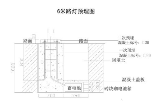 4)、澆筑路燈基礎預埋件:在開挖的1米深的坑中,把凱創光電預先焊接的預埋件放置到坑中,并將鋼絲管放到預埋件正中間,另放到埋放蓄電池處。并保持預埋件、地基與地面在同個水平面上。然后用C20混凝土對預埋件進行澆筑固定。澆筑過程中不斷攪拌勻稱,以保證整個預埋件的密實性和牢固性。